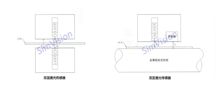 激光在线测厚仪有两种检测方式,分别为双面激光检测(2个激光三角测量传感器)和单面贴辊检测(一个激光三角测量传感器),两种检测方式都是通过测量传感器到被测材料表面的距离。根据设计安排,一个附加的传感器,通常是高精密涡轮传感器,用来测量双面传感器之间的距离或测量单面传感器到参考辊之间的距离。